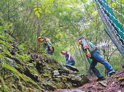 护林员宾元鹏(左一)一行在崇山峻岭间穿行。何超/摄