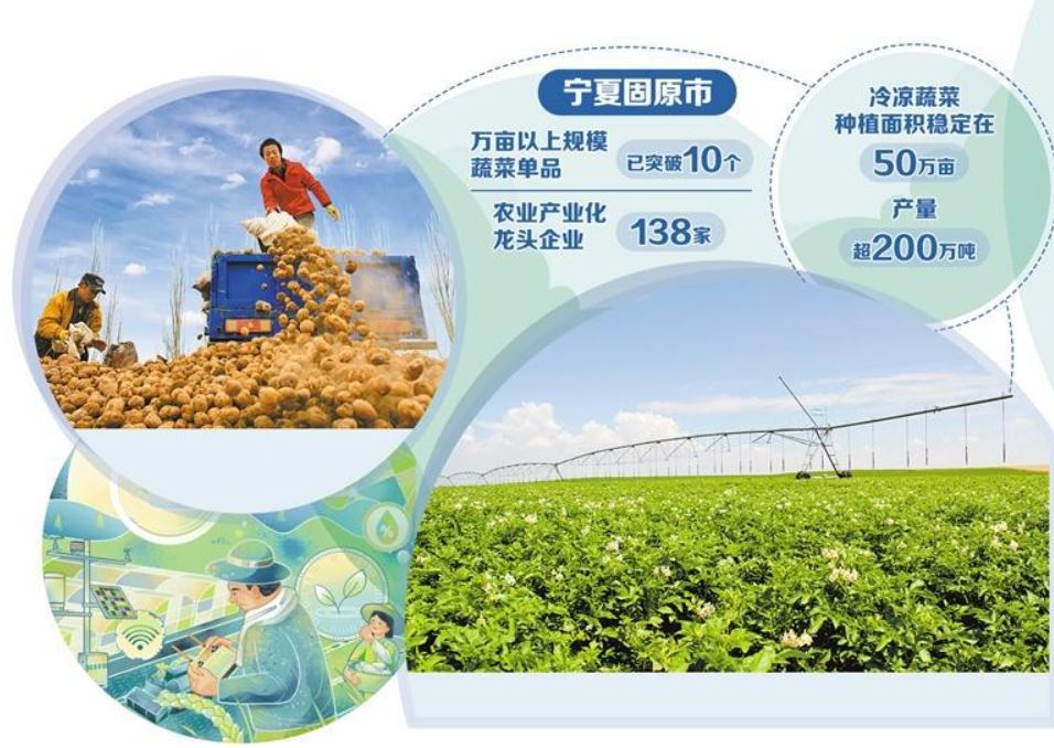 目前,固原市万亩以上规模的蔬菜单品已突破10个,冷凉蔬菜种植面积稳定在50万亩,产量超200万吨,产业链产值超过45亿元,80%的蔬菜销至华北、华中、华南等地区。