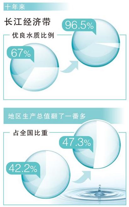 优良水质比例从67%提升到96.5%,与此同时,地区生产总值翻了一番多,占全国比重从42.2%提升到47.3%。