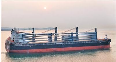 3月28日,7套国产风电设备在山东港口烟台港蓬莱港区完成装船并发往奥地利。随着中国风电企业不断拓展欧洲市场,烟台港目前已形成月均两班的欧洲风电设备发运频次。图为装载着出口奥地利风电设备的货轮从山东港口烟台港蓬莱港区起航(无人机照片)。唐克摄(新华社发)